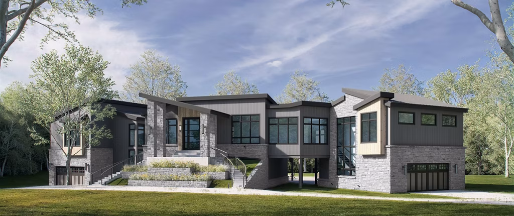 This home showcases a bold and modern mountain-inspired design that seamlessly blends rustic materials with clean, contemporary lines. The striking contrast of natural stone, vertical board-and-batten siding, and warm wood accents creates a dramatic yet inviting façade.  The interior blends modern warmth with timeless elegance, featuring white oak cabinetry, natural stone surfaces, and soft white walls for a light, airy feel. Blackened metal accents, brass fixtures, and fluted wood details add depth and sophistication, while bold contrasts and refined textures create a curated, high-end aesthetic that feels both elevated and inviting.